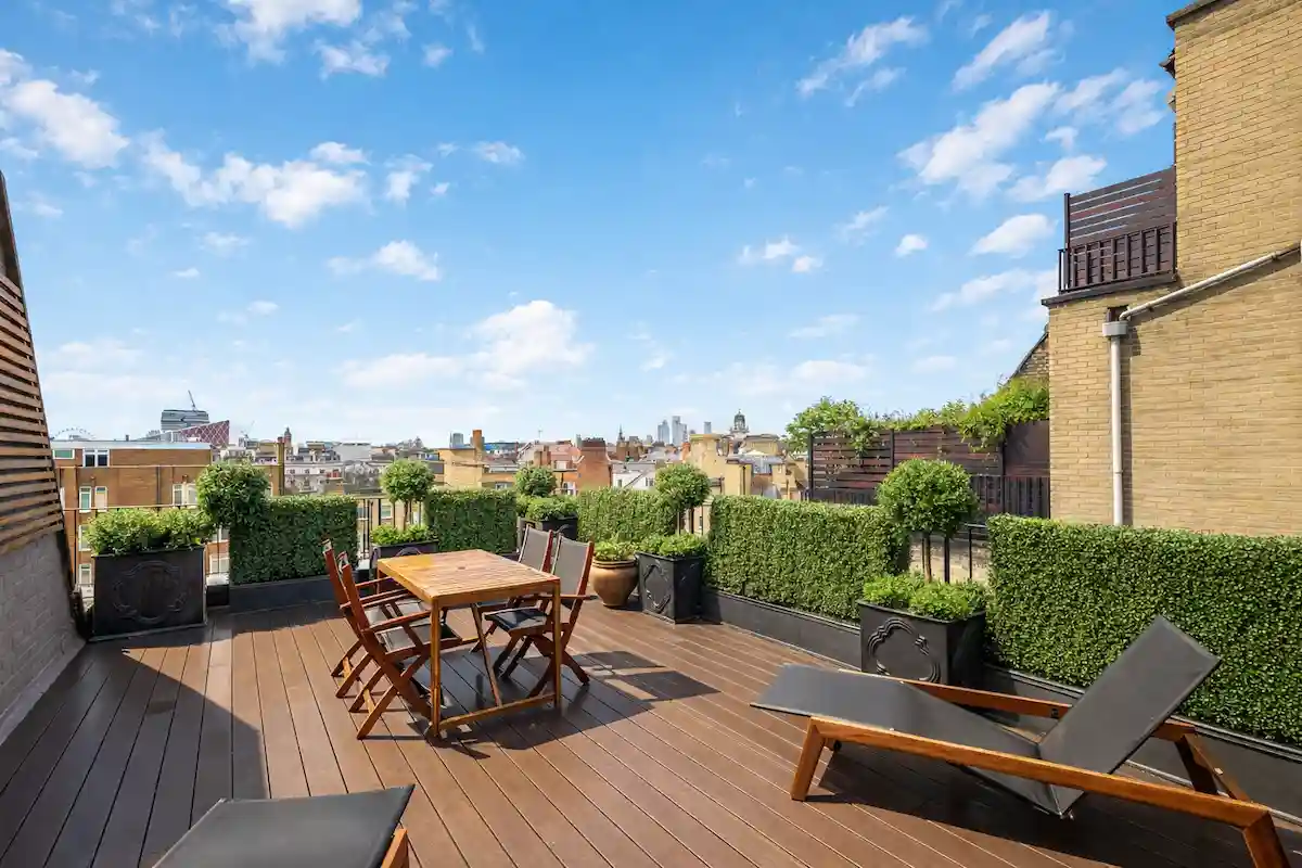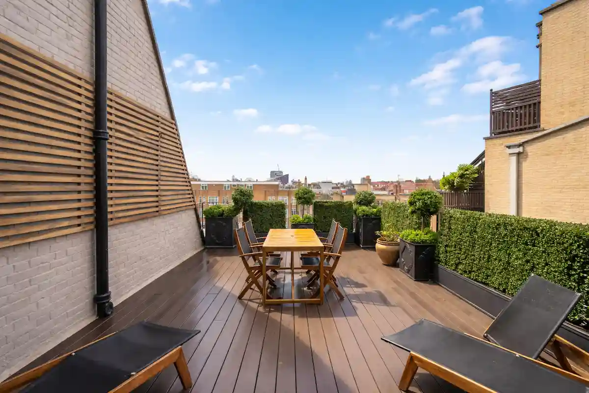 A true highlight of the property is the expansive private terrace, an exceptional Chelsea rarity, offering elevated privacy, outdoor dining, sun loungers, and sweeping skyline views. Three beautifully appointed bedrooms provide serene retreats, including a lower-level queen bedroom with direct terrace access, an upper-level king bedroom opening onto a private balcony terrace, and a stylish double bedroom with captivating city views. Two luxury bathrooms and an additional guest cloakroom complete the home, all finished to a high standard.