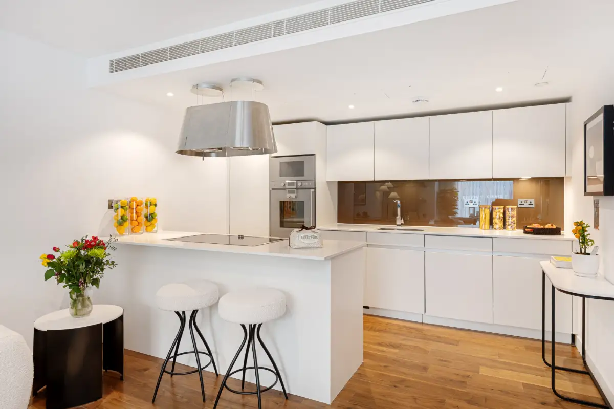 The spacious apartment features an elegant open-plan living and dining area alongside a fully equipped Gaggenau kitchen designed for both comfort and functionality. Three well-appointed bedrooms—including king and queen configurations—are complemented by stylish bathrooms with rainfall showers and a walk-in wardrobe. With central air conditioning, ultra-fast Wi-Fi, and a dedicated private workspace, the residence is perfectly suited for executive stays in Central London.