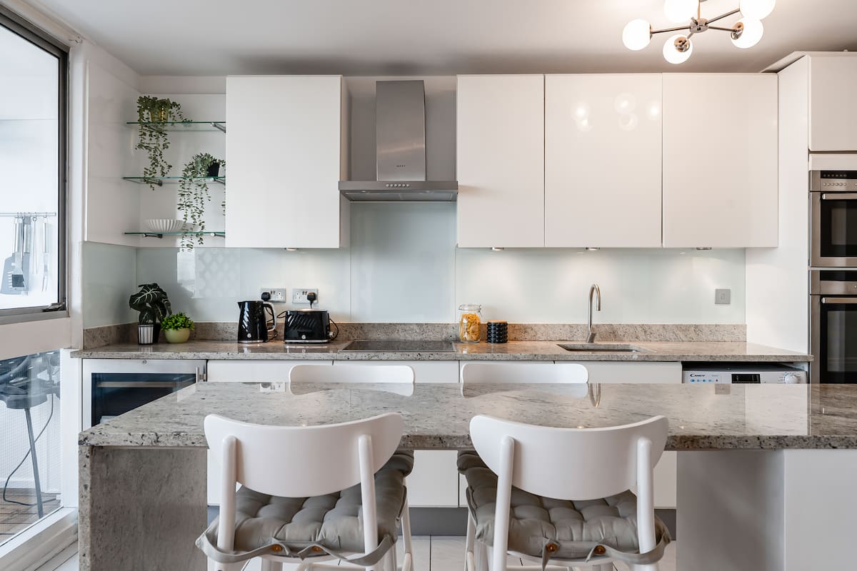 The upper level is dedicated to stylish living and entertaining, with a light-filled open-plan space, plush sofa bed, and an automated drop-down projector that transforms the room into a private home cinema. A sleek, fully equipped kitchen with island makes cooking and hosting effortless, while the elegant design throughout reflects the sophistication of its prestigious location.
