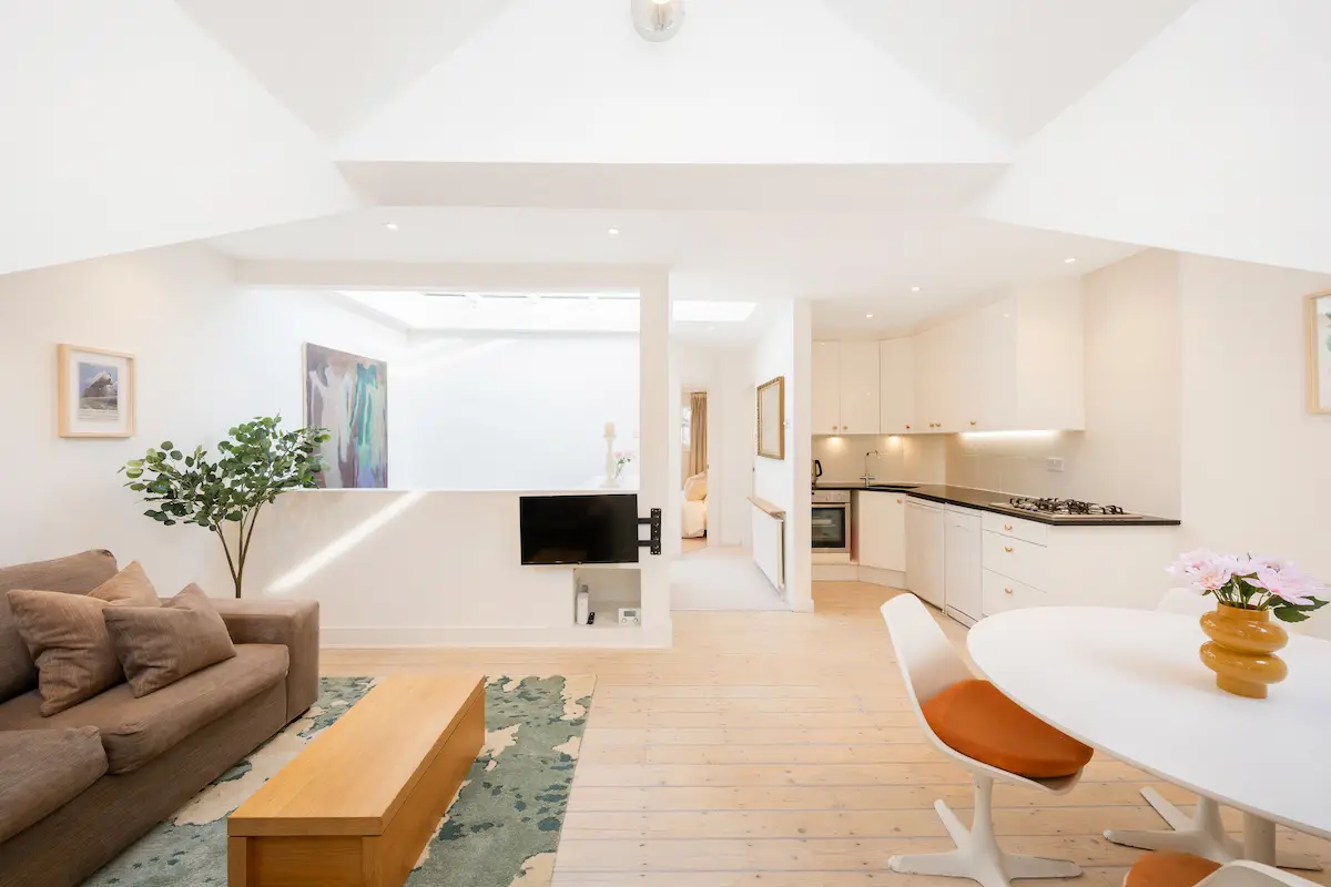 The apartment sleeps up to four guests with a king-size bedroom, a sofa bed in the living area, and an optional fold-up guest bed on request. A fully equipped kitchen, modern bathroom with bath and shower, washer and dryer, premium linens, and quality toiletries ensure a comfortable stay. Quiet, private, and thoughtfully prepared, this penthouse is a perfect base for exploring London or enjoying a longer visit.