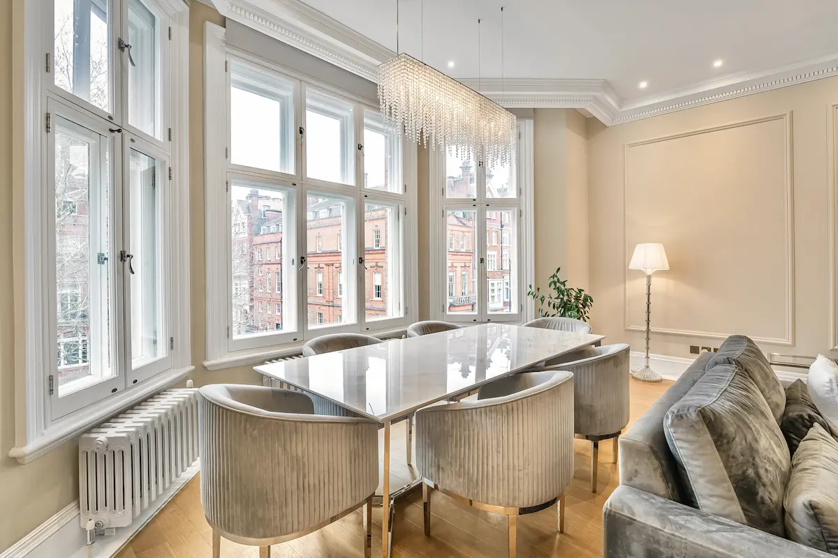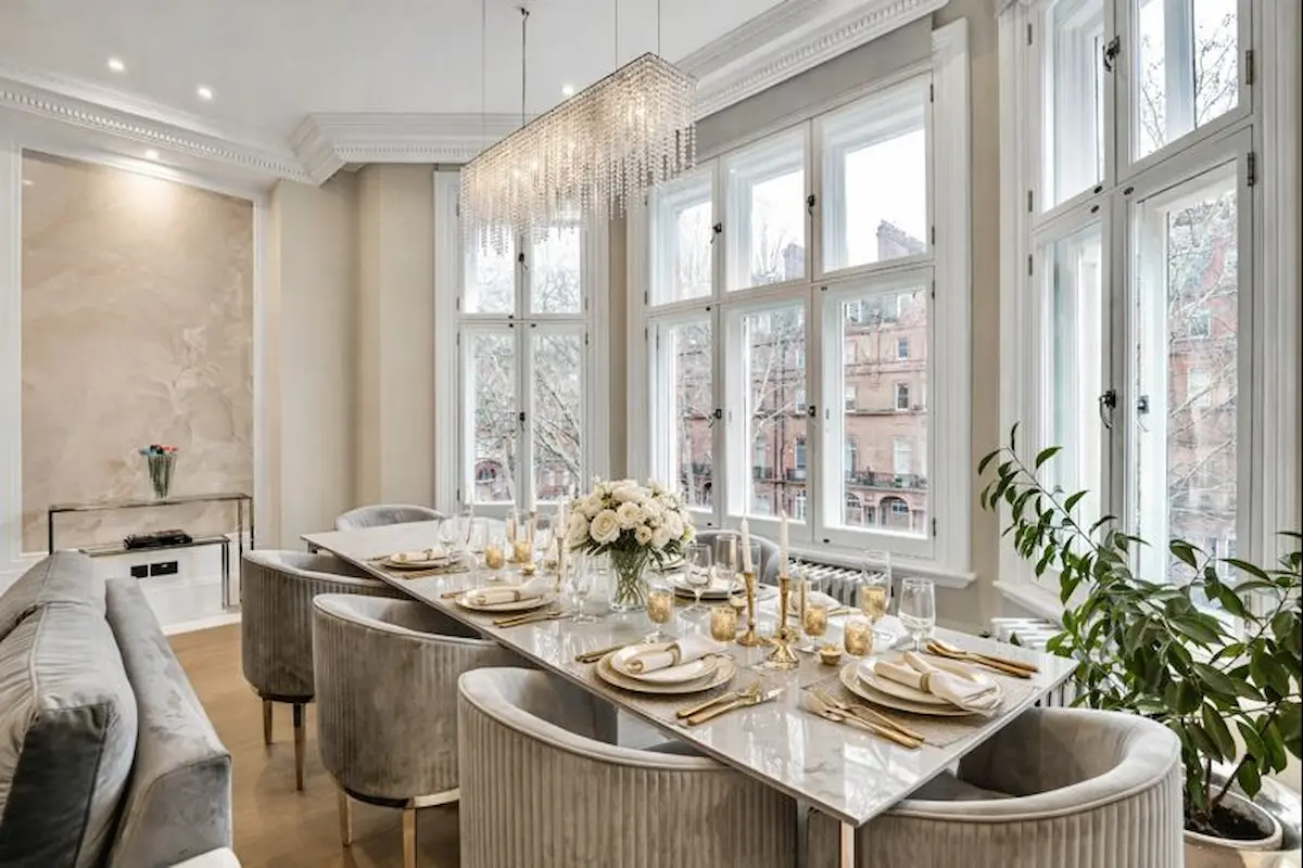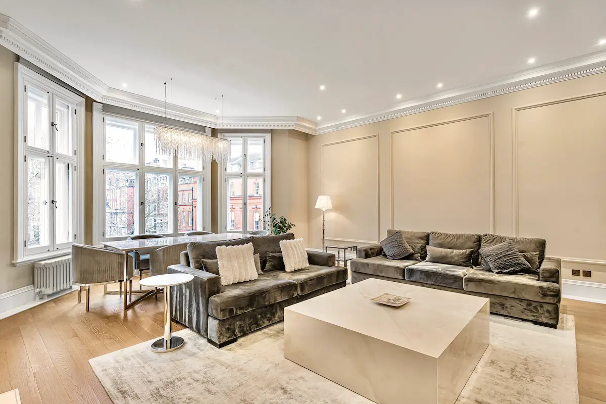 Experience refined luxury in this exceptional Knightsbridge apartment on prestigious Pont Street, where privacy, elegance, and architectural detail come together seamlessly. With private lift access directly into the residence, this three-bedroom, two-and-a-half-bathroom home offers a discreet VIP arrival and an immediate sense of exclusivity. The grand open-plan living and dining space is bathed in natural light, featuring a marble dining table beneath a statement chandelier, plush designer seating, a sleek fireplace, and bespoke finishes throughout, ideal for both entertaining and relaxed evenings in.