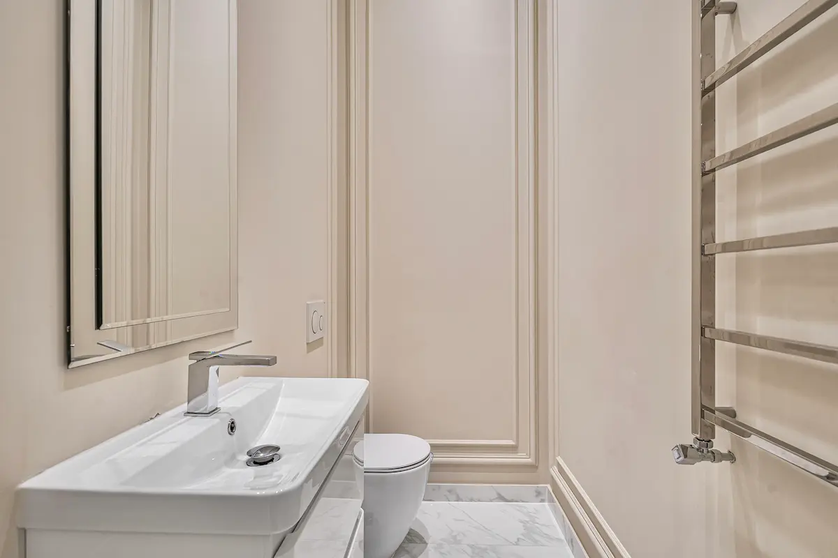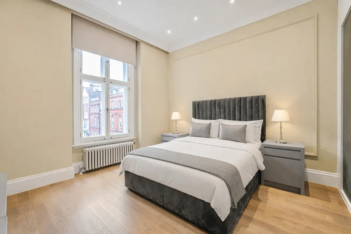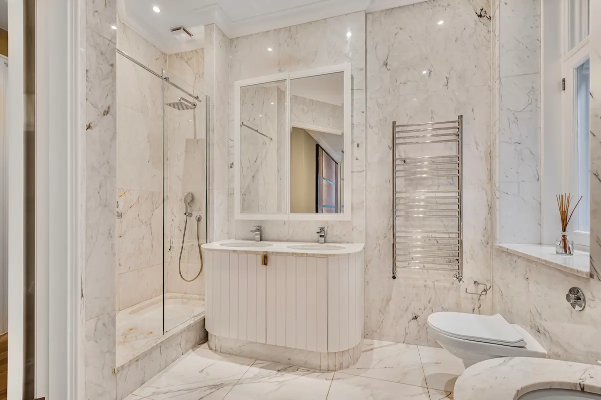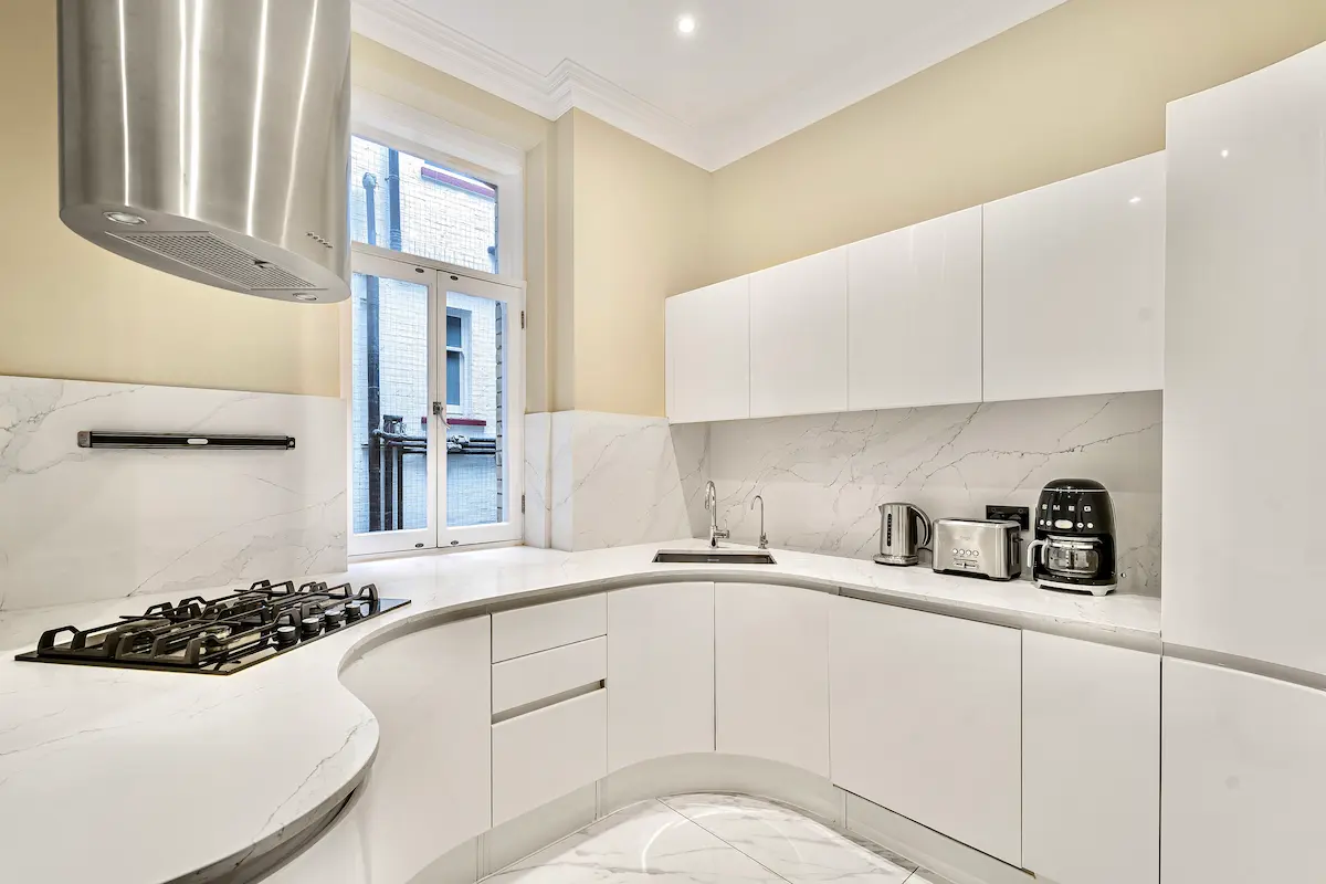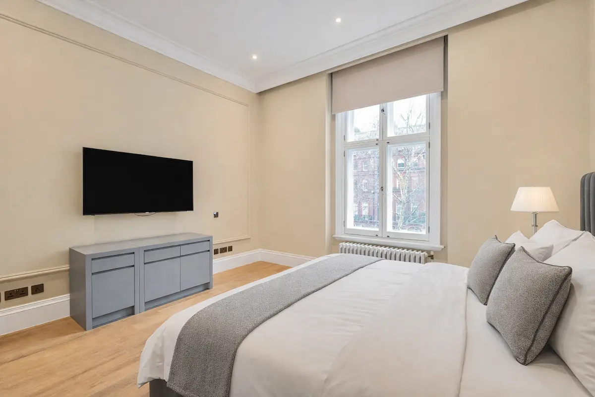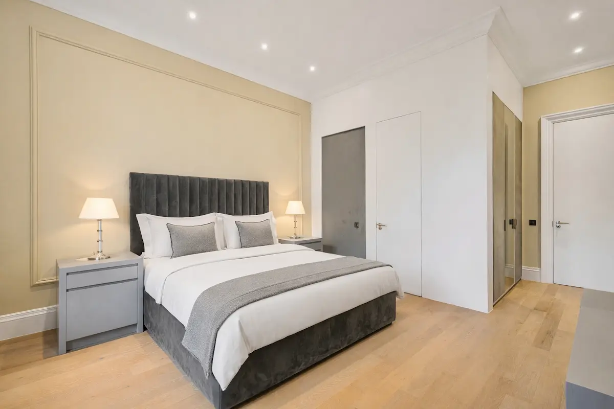 The apartment continues to impress with a fully fitted white marble kitchen, premium appliances, and a stylish breakfast bar, alongside a sumptuous super king master suite complete with a spa-style marble bathroom, freestanding bathtub, rainfall shower, and walk-in wardrobe. A second en-suite bedroom offers equal comfort, while the third room provides flexible use as a home office or additional bedroom.