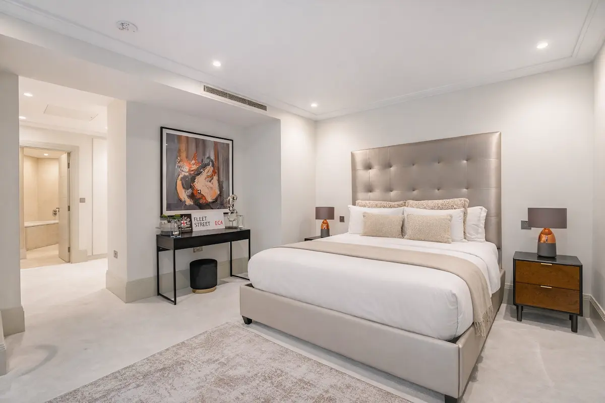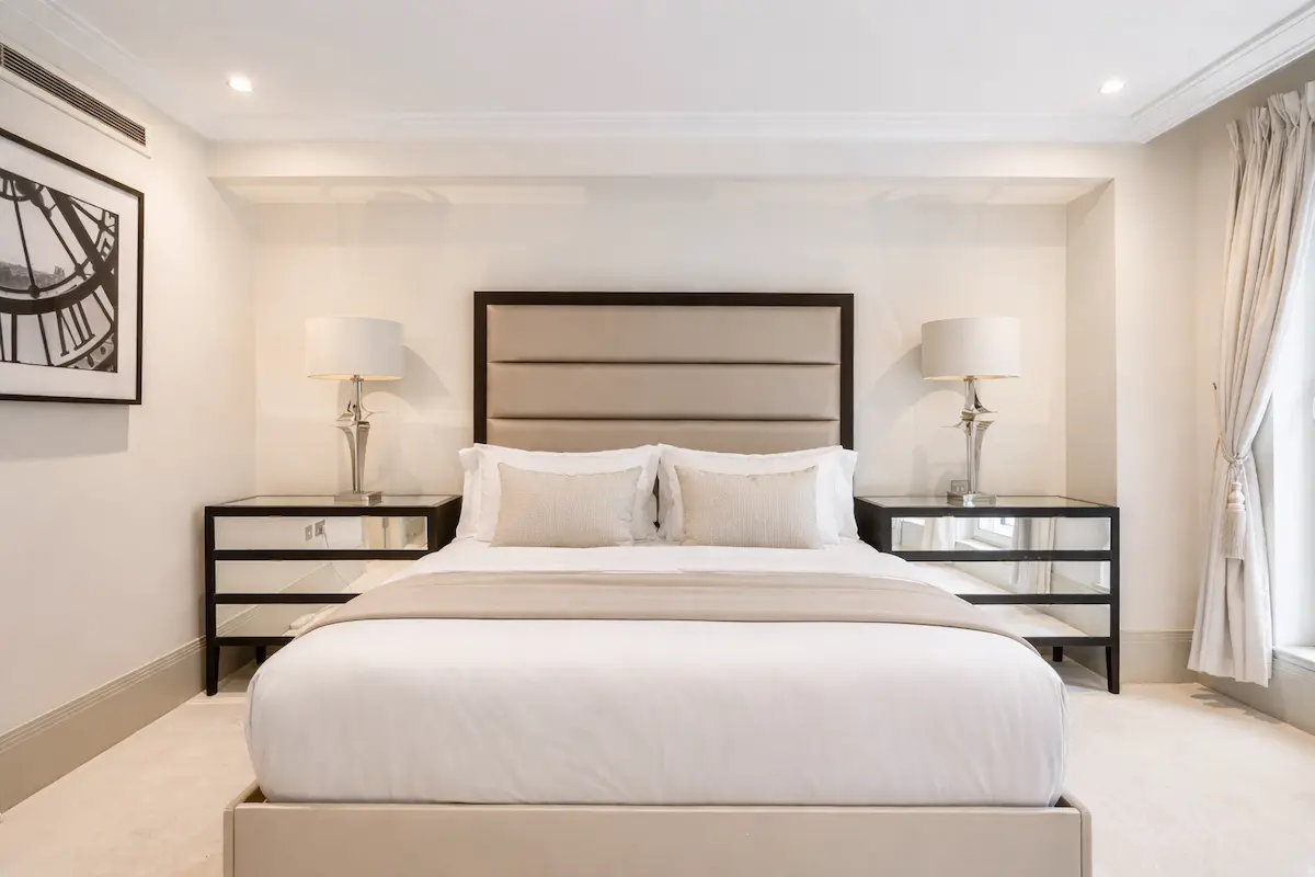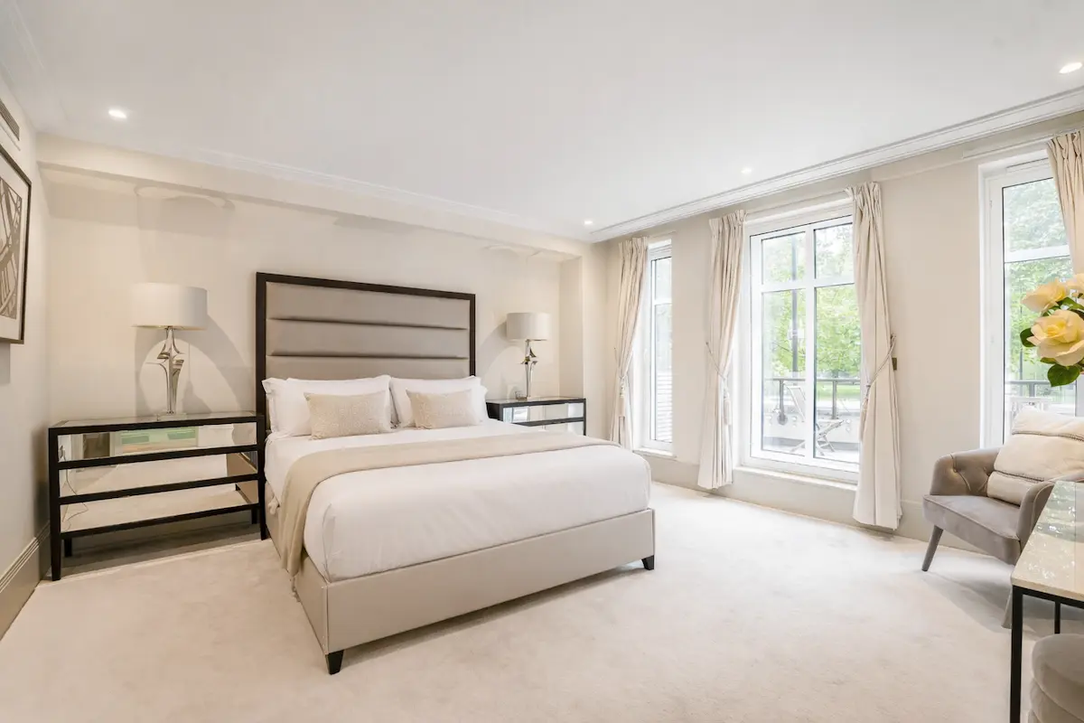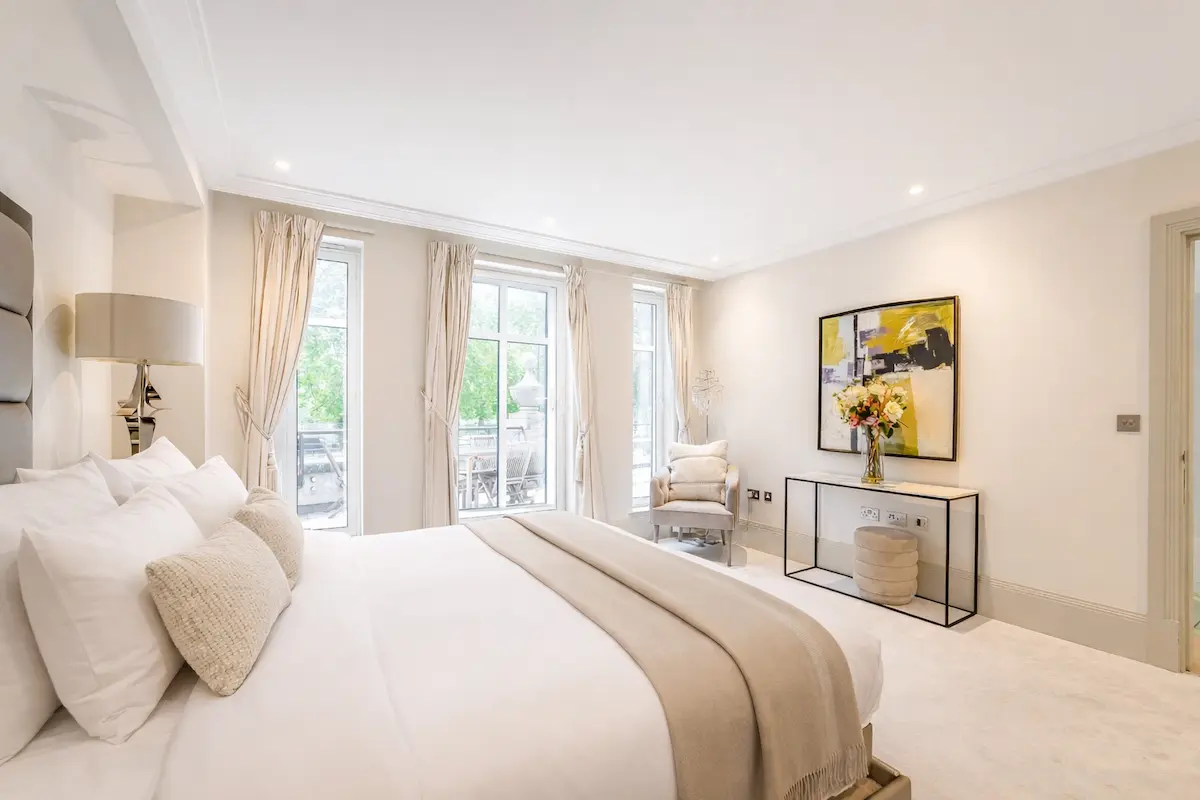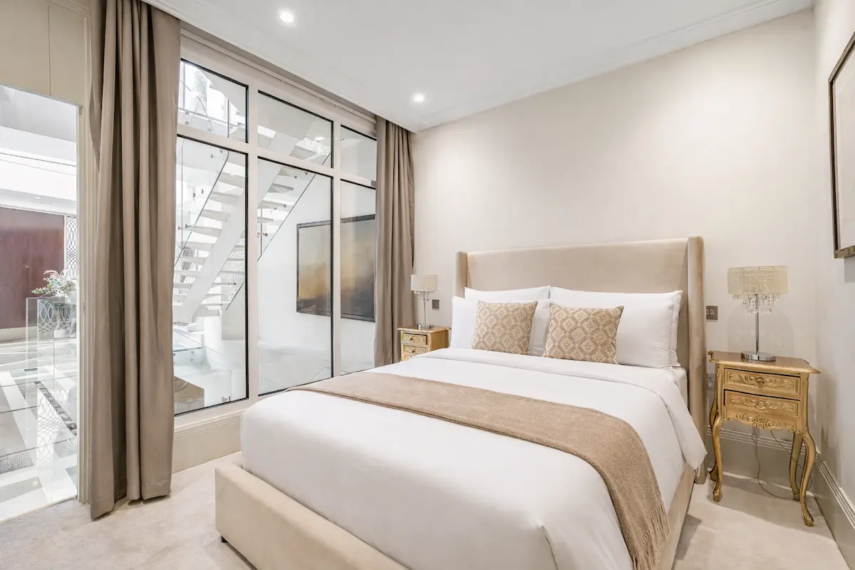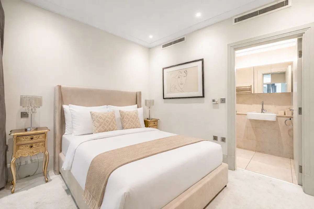 The top-floor master suite features a super king bed, marble spa ensuite, walk-in wardrobe, and private terrace, while two additional bedrooms, a bespoke living room, and a gourmet kitchen ensure comfort and style for up to ten guests. With private terraces, refined furnishings, 24/7 concierge service, and London’s finest boutiques, dining, and cultural landmarks at your doorstep, this is a truly unrivalled urban escape in the heart of Mayfair.