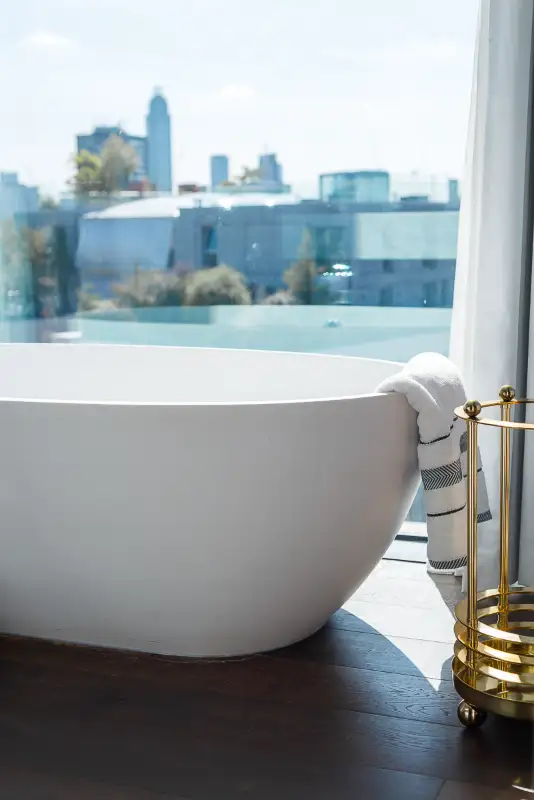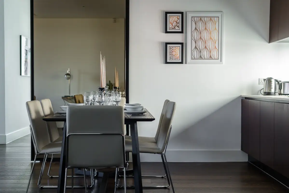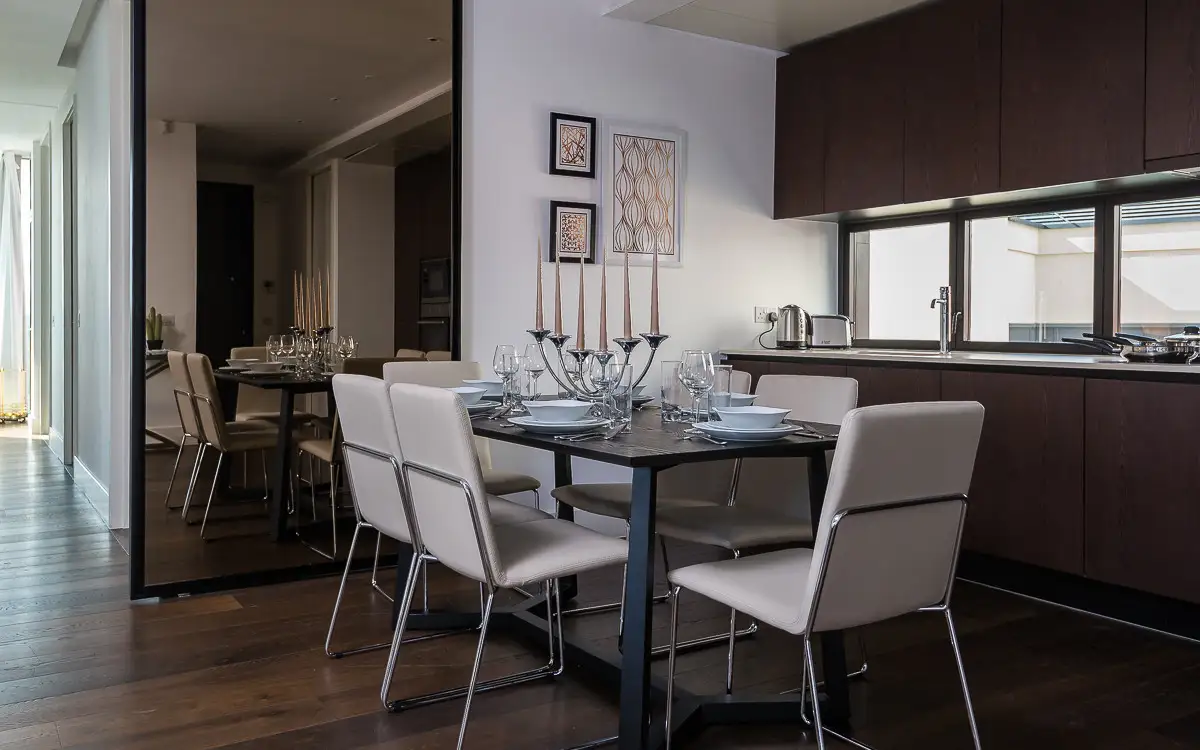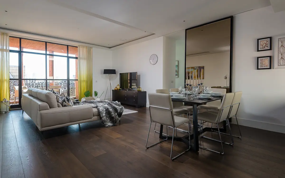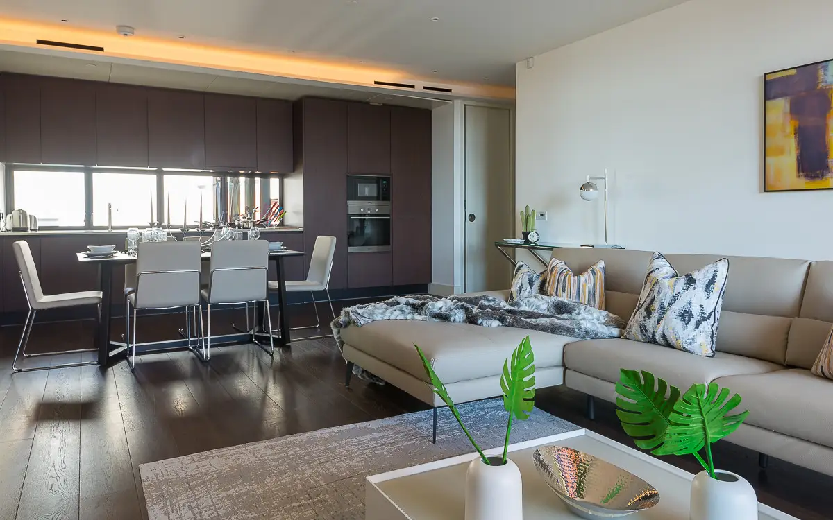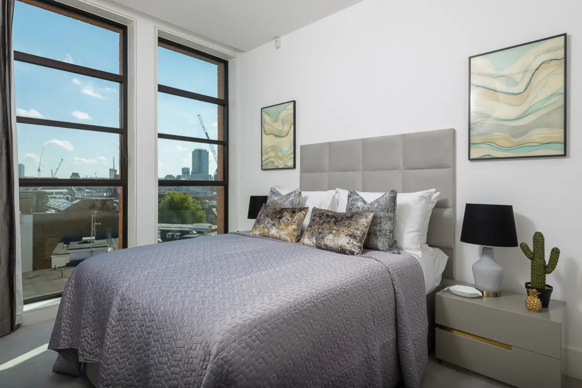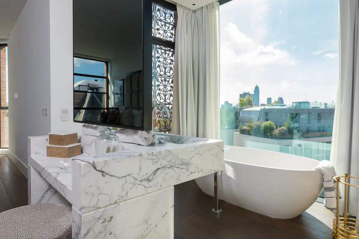 The master suite includes a freestanding bathtub, rainfall shower, and elegant his-and-hers sinks, creating a relaxing retreat. Situated in a secure development with concierge service, the apartment offers privacy, comfort, and beautiful London views—ideal for executive travelers, families, or extended stays in the heart of the city.